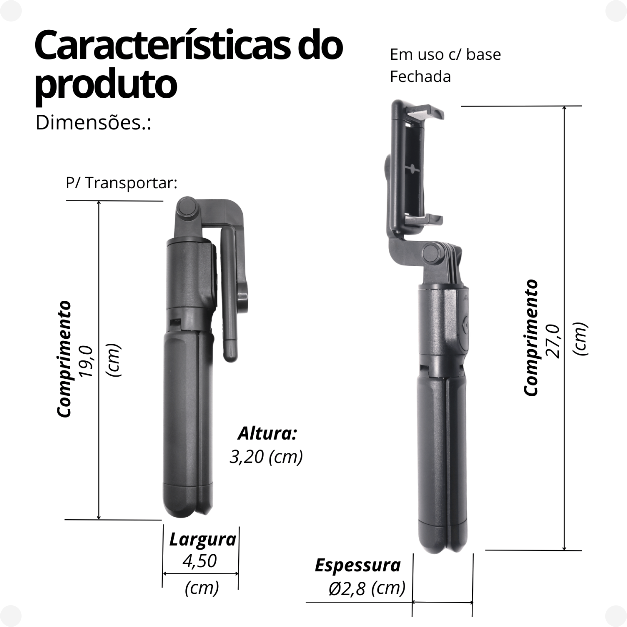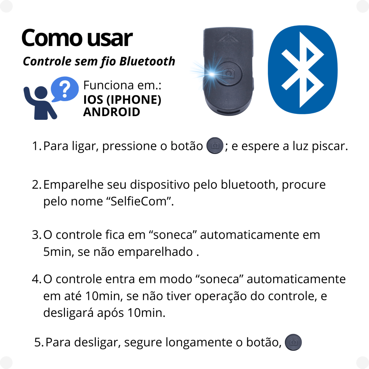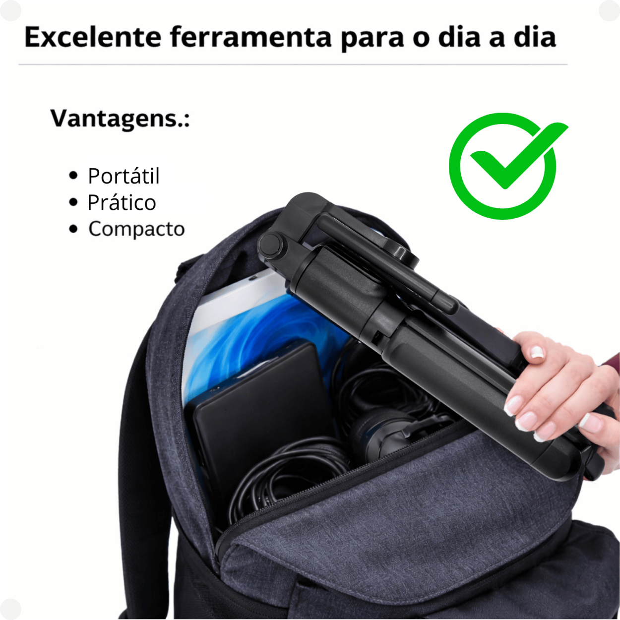 O controle remoto Bluetooth incluso facilita o disparo à distância, perfeito para selfies, gravações, chamadas de vídeo e produção de conteúdo. Compatível com celulares Android e iOS, além de câmeras de ação (com adaptador), ele ainda permite uso na vertical ou horizontal, ajuste de ângulo e rotação, garantindo versatilidade total.