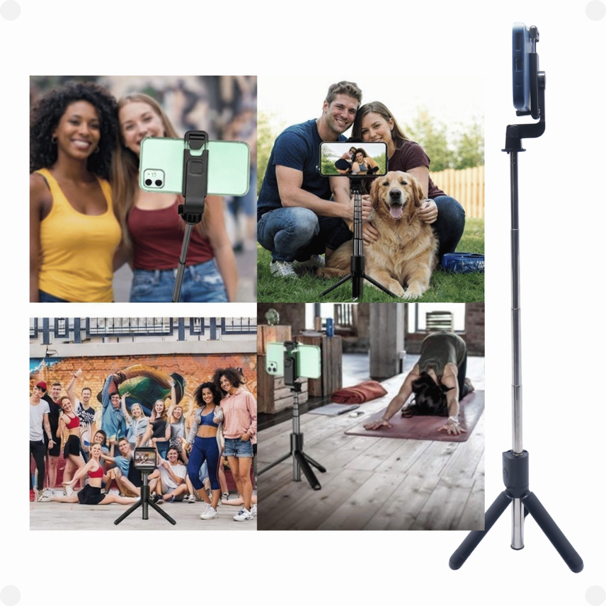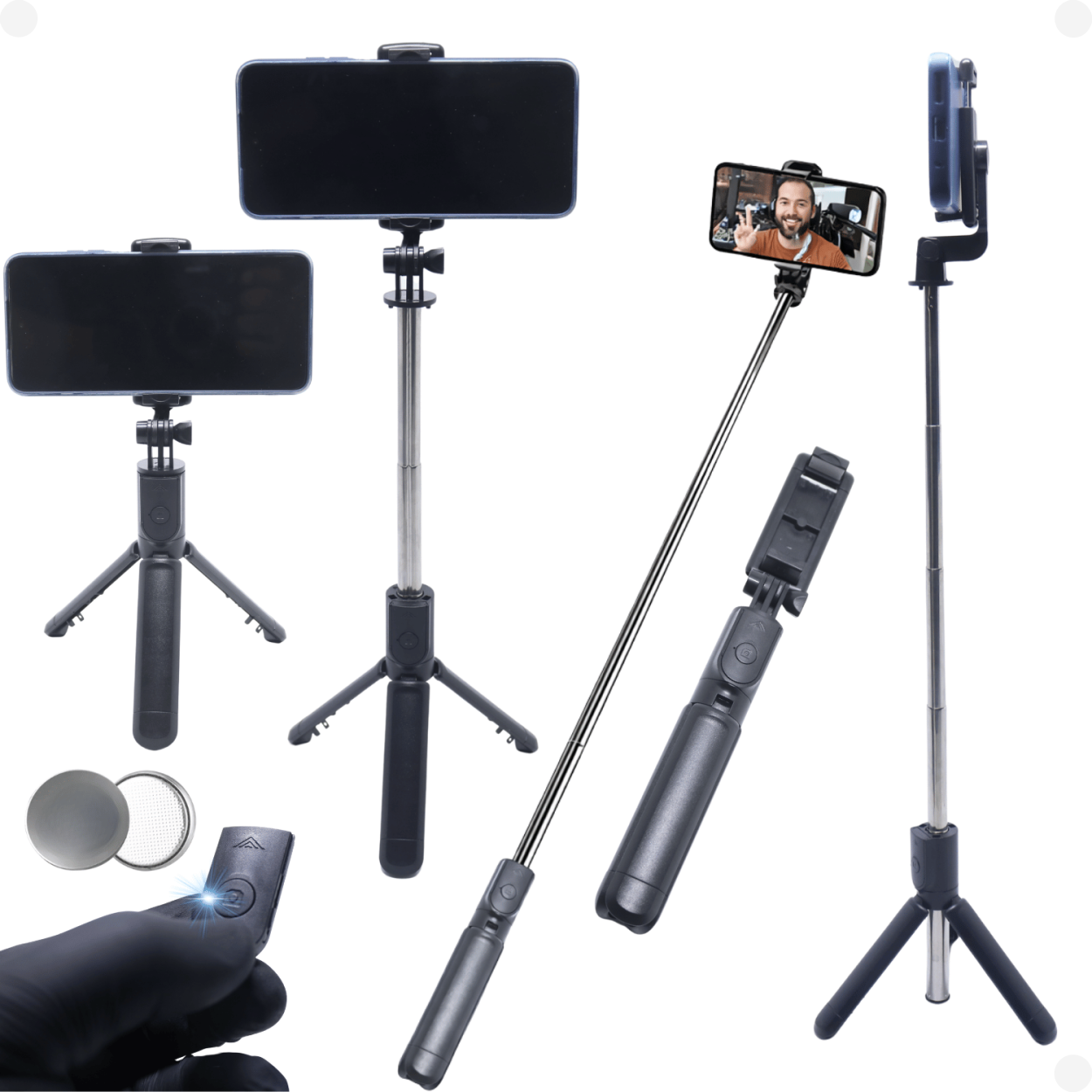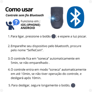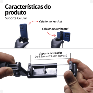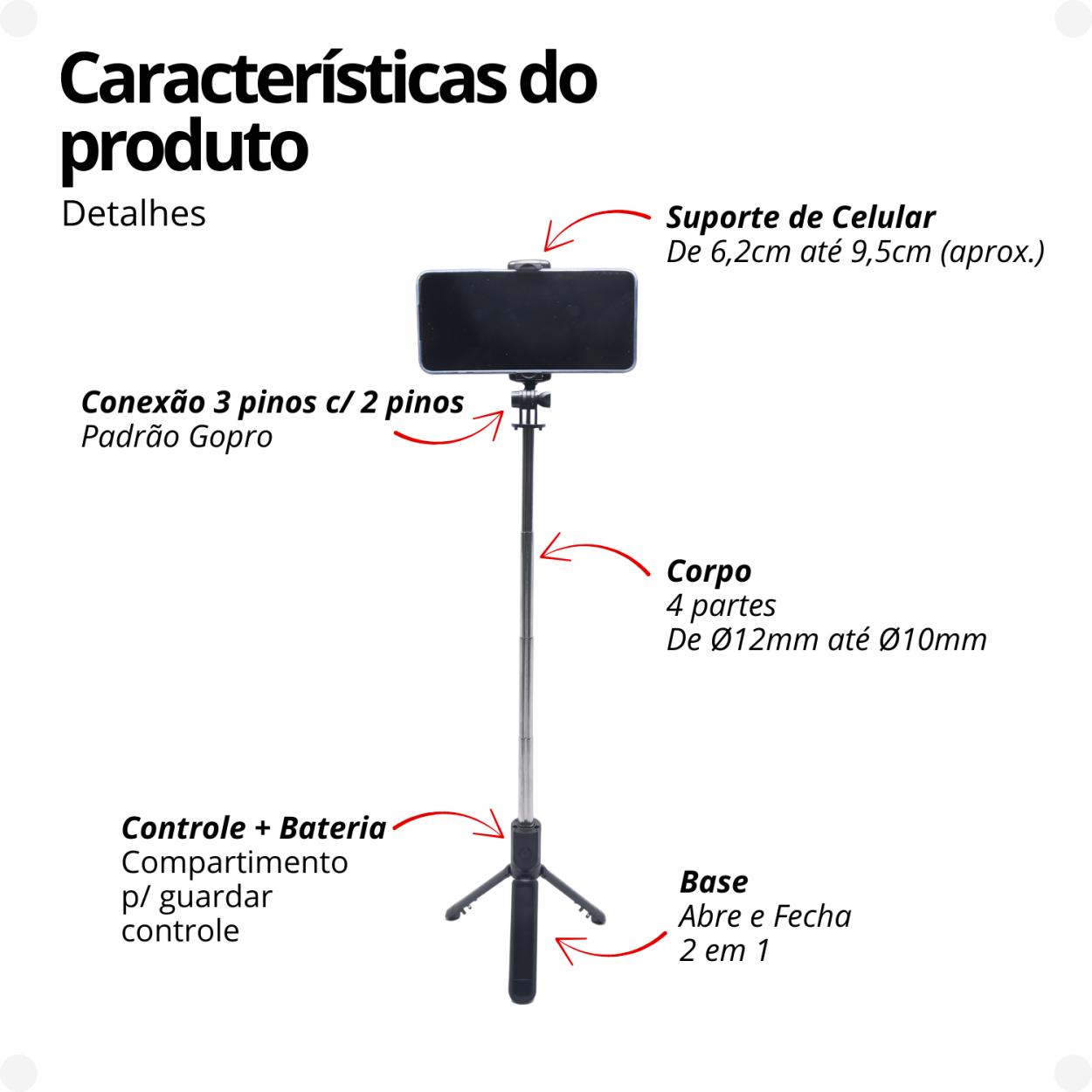 O controle remoto Bluetooth incluso facilita o disparo à distância, perfeito para selfies, gravações, chamadas de vídeo e produção de conteúdo. Compatível com celulares Android e iOS, além de câmeras de ação (com adaptador), ele ainda permite uso na vertical ou horizontal, ajuste de ângulo e rotação, garantindo versatilidade total.