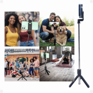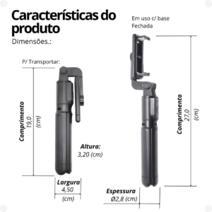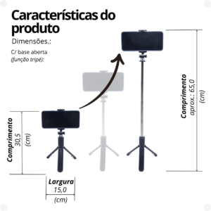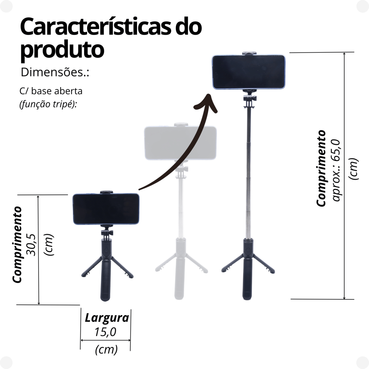 Capture fotos e vídeos com muito mais liberdade e estabilidade usando este Suporte para Celular com Bastão de Selfie e Tripé Integrado. Compacto quando fechado e leve para transportar, ele se estende até aproximadamente 65 cm, permitindo ângulos amplos e enquadramentos profissionais em qualquer situação.
