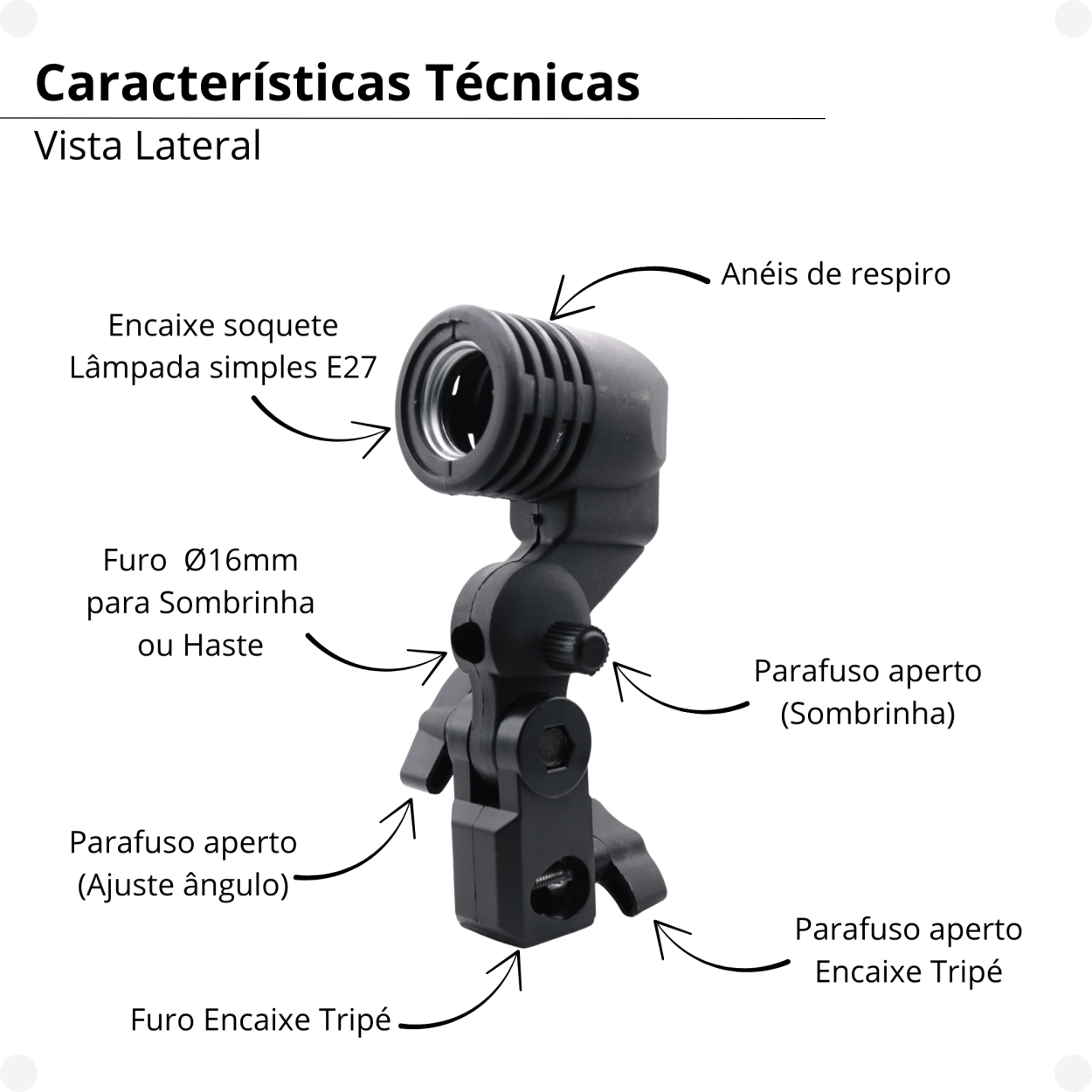 O Soquete Simples E27 é a escolha ideal para quem busca praticidade, durabilidade e segurança na montagem de sistemas de iluminação. Fabricado em plástico rígido resistente, ele oferece excelente sustentação e estabilidade para lâmpadas de diferentes tipos — desde modelos LED até incandescentes. Com design funcional e acabamento preto fosco, combina perfeitamente com tripés e hastes, permitindo uma instalação rápida e eficiente em estúdios, oficinas, residências ou ambientes comerciais.